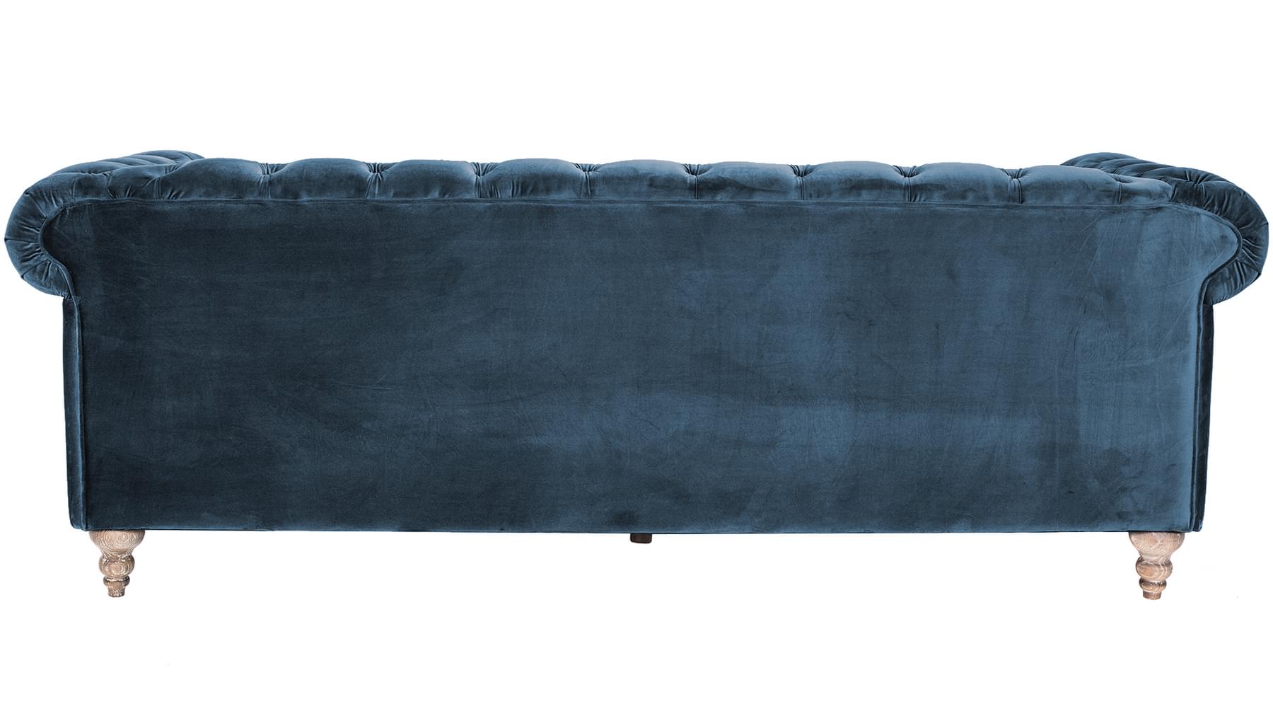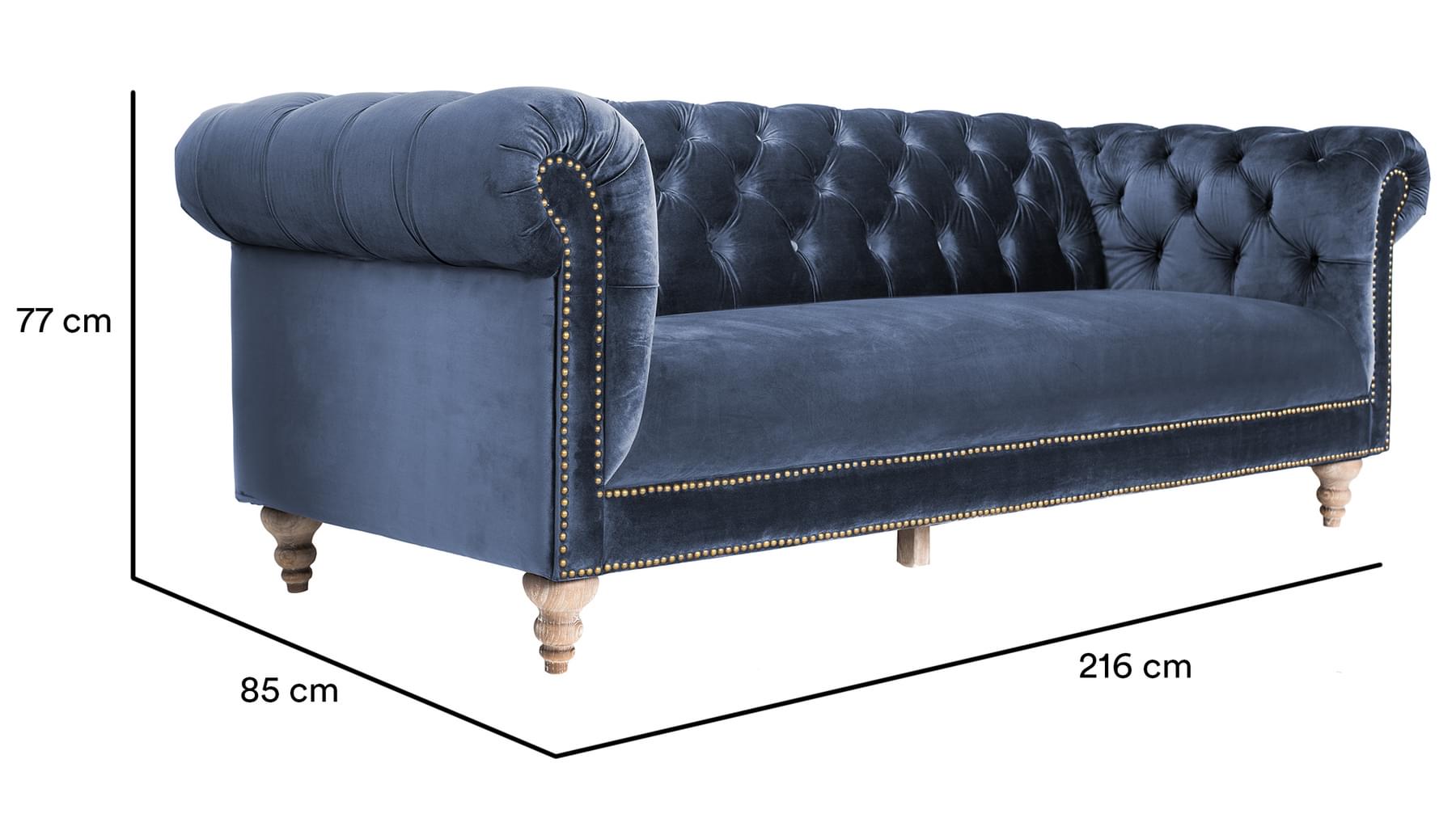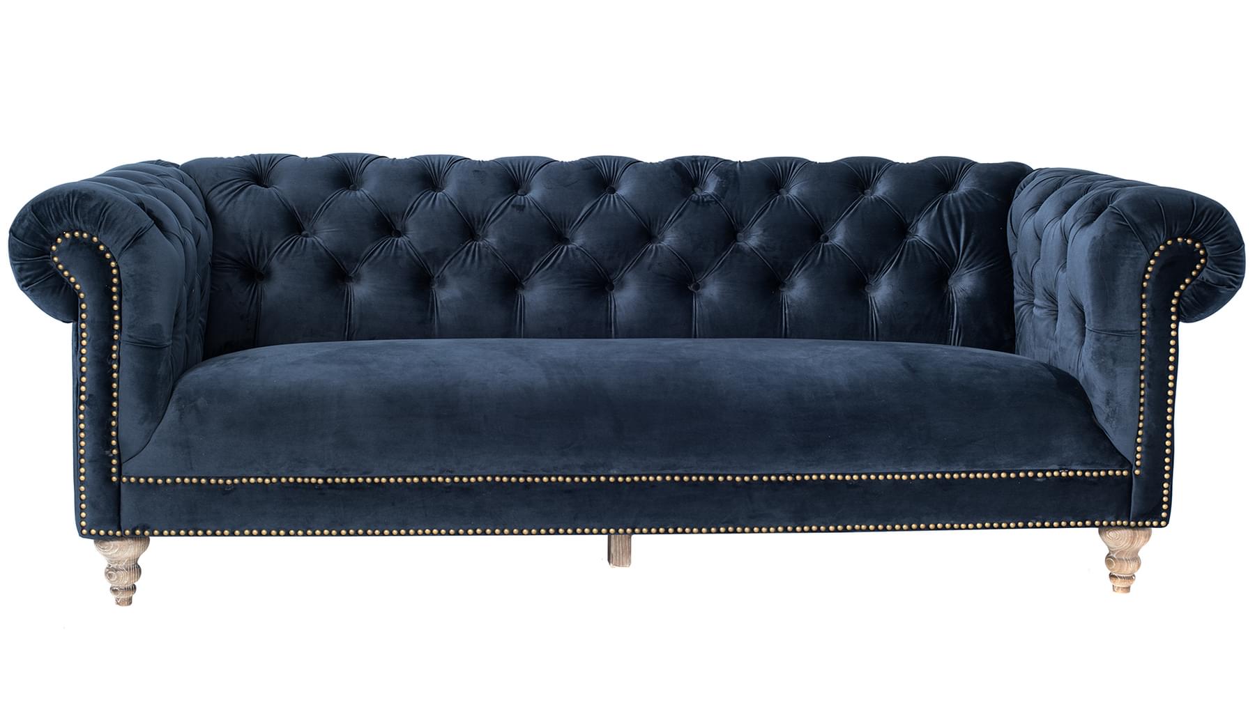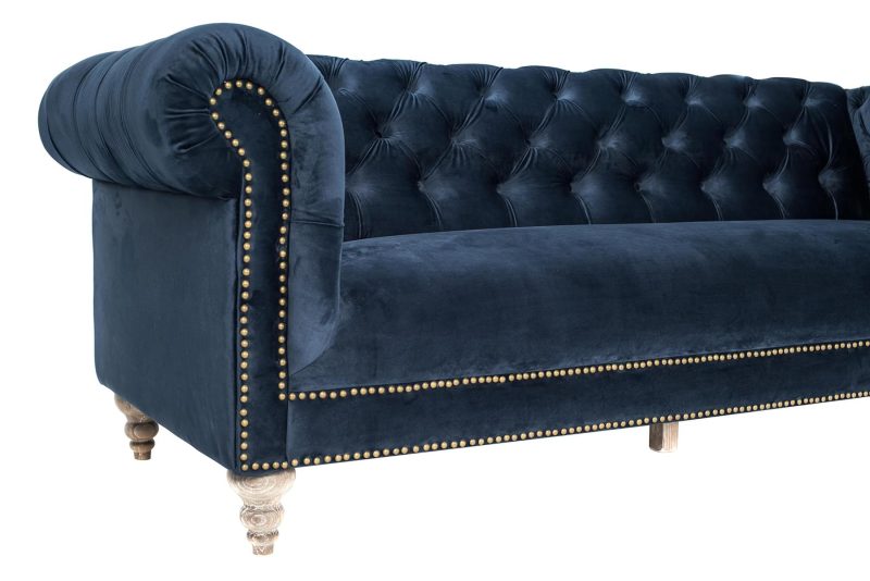 Glæsilegur þriggja sæta sófi úr þykku sléttflaueli. Sófinn er bólstraður með samlita hnappa í baki og örmum og gyllta hnappa að framan. Sófinn er með ljósa, fallega skorna viðarfætur. Einstaklega flottur sófi sem fæst dimmblár eða grár.