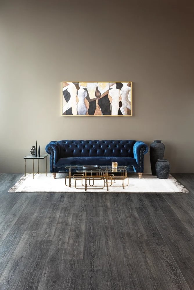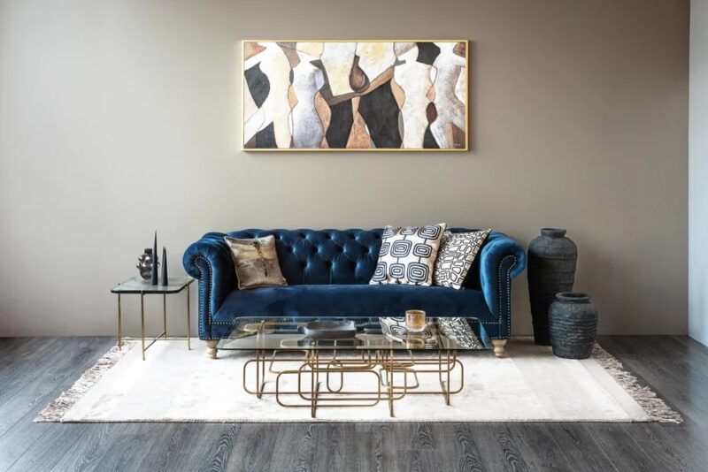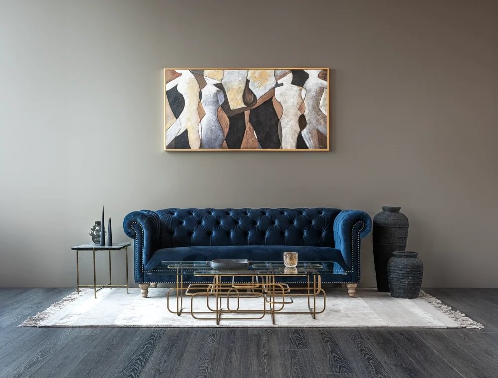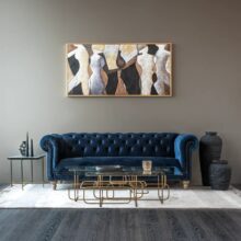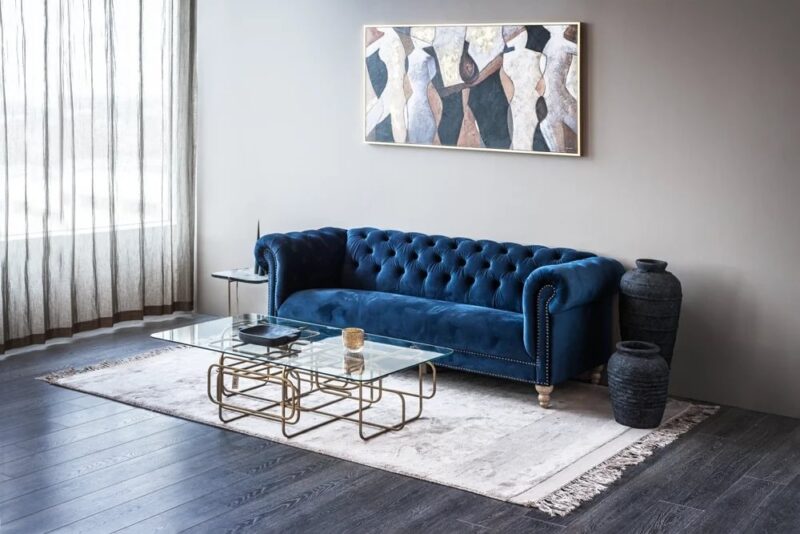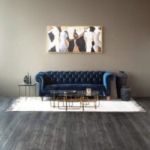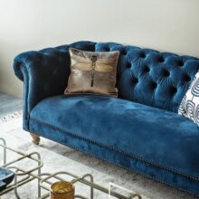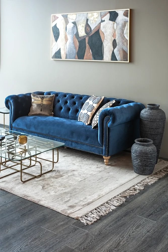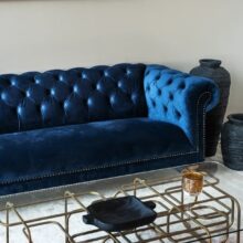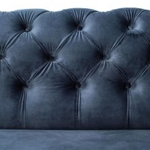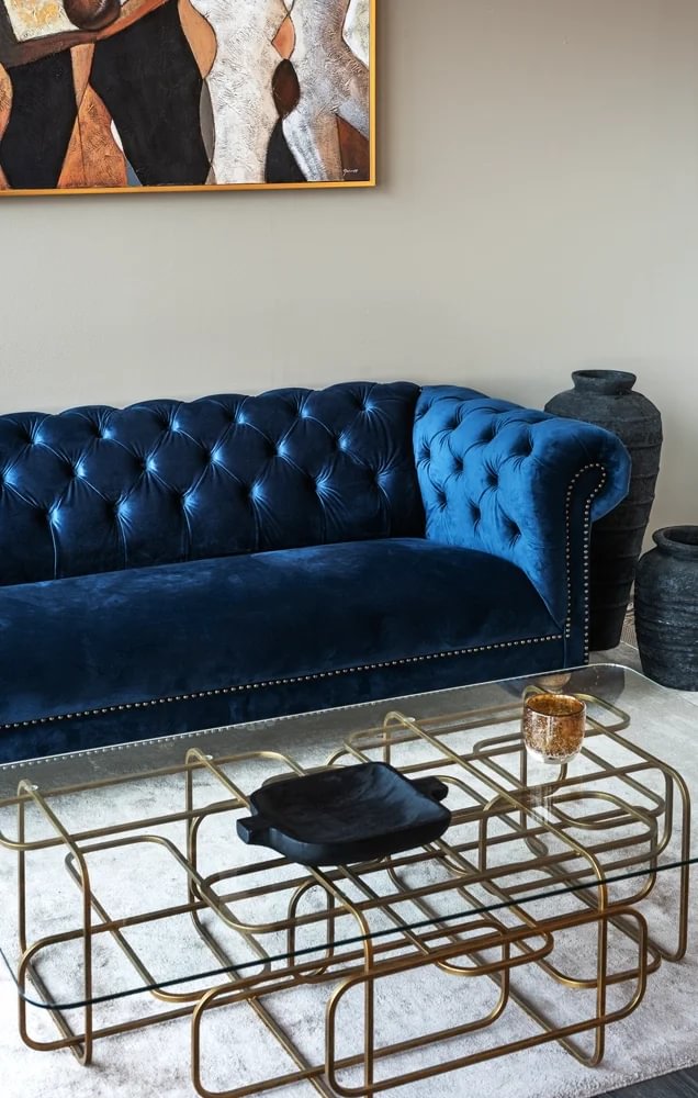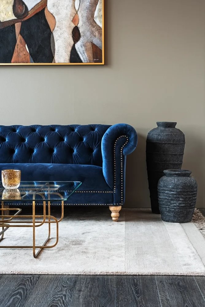 Glæsilegur þriggja sæta sófi úr þykku sléttflaueli. Sófinn er bólstraður með samlita hnappa í baki og örmum og gyllta hnappa að framan. Sófinn er með ljósa, fallega skorna viðarfætur. Einstaklega flottur sófi sem fæst dimmblár eða grár.