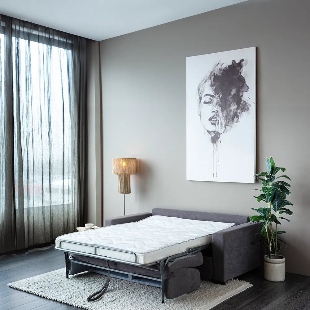 Sérlega vandaður og veglegur ítalskur svefnsófi. Bak er dregið fram á einfaldan hátt til að opna fjaðrandi stálgrind. Þar liggur sérlega þykk, heil (laus) 194×140×18 cm svampdýna sem fylgir. Svefnsófi sem fer vel með gestina. Fæst í nokkrum áklæðum.
